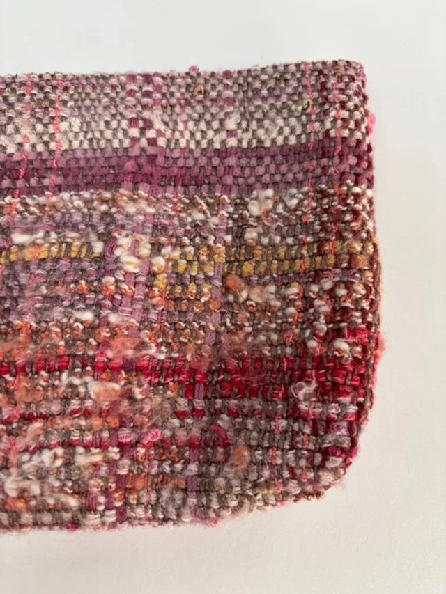 Great size pouch with my handwoven fabric. It’s perfect for money, cards, cosmetic items, snacks, medication, phone charger, and so many things. It’s useful for a trip or daily use. Special adhisive interfacing makes it very sturdy. Mostly cotton with mixed medium.
